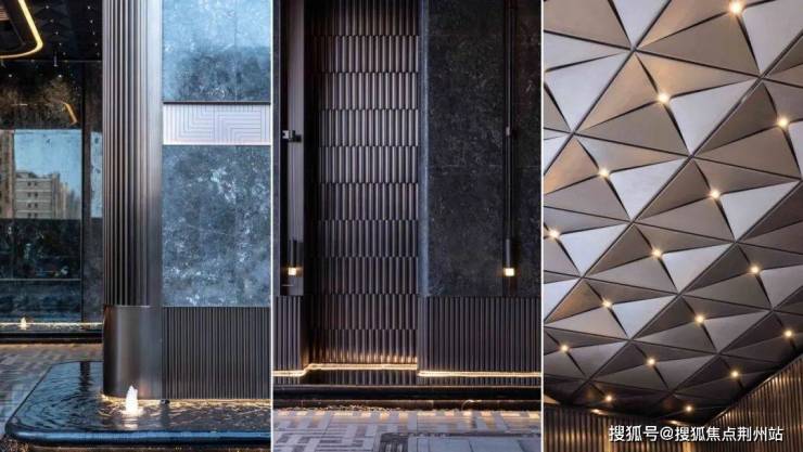 下沉式庭院巧妙布局了一片广阔的景观水域,象征着“将江水引入园中”,其周围环绕着清澈透明的玻璃幕墙和质感独特的黑耀灰大理石墙面,形成一幅宁静而庄严的景象。