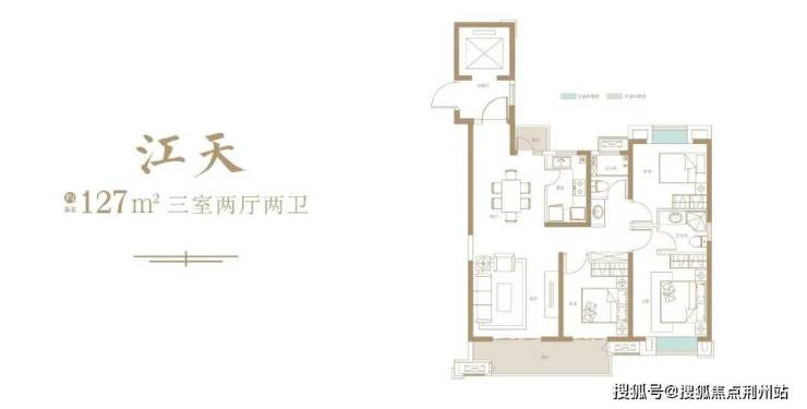 建面约127平三室两厅两卫:此户型位于楼栋的东边户,南北通透,南北卧室都有飘窗的设计,主流的边套三房,江景视野有限。