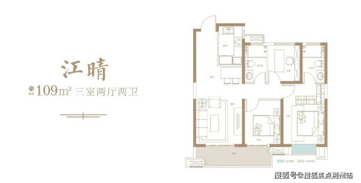 建面约109平三室两厅两卫:此户型位于2、4号楼的中间套,动静分区,三开间朝南,常规的连廊中间套户型,也是该项目最小面积户型。