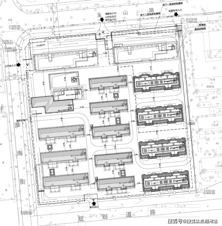 根据规划,项目社区配建一个下沉式庭院会所,主出入口在玉山路,淮海街上设有一人行出入口,南侧规划道路还有一车行出口。