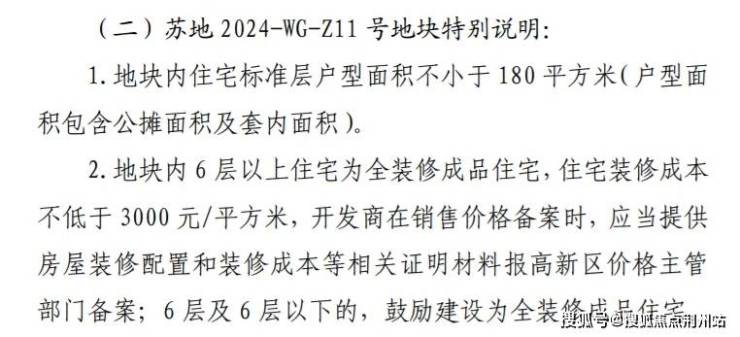 根据规划要求,地块内住宅标准层户型面积不小于180平方米,地块内6层以上住宅为全装修成品住宅,住宅装修成本不低于3000元/平方米,6层及6层以下的,鼓励建设为全装修成品住宅。