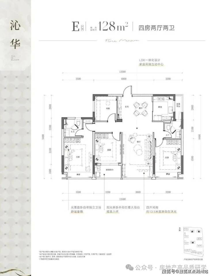 建筑面积约128平方米的四室两厅双卫户型,设计巧妙,四开间均朝南,配备私密式阳台,享受充足的南向自然光照,营造出开阔而明亮的居住空间。