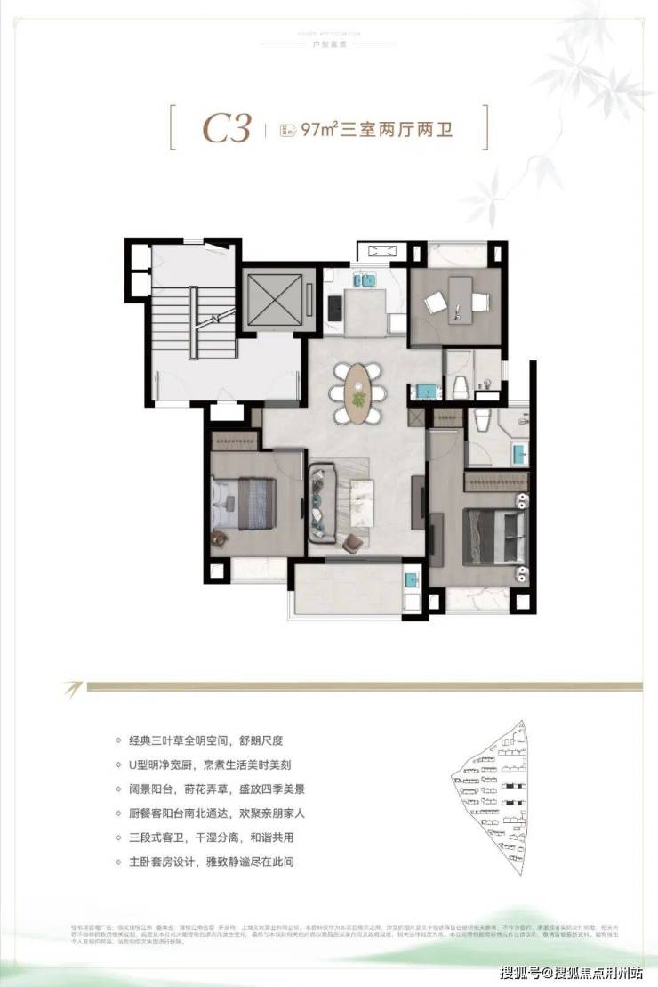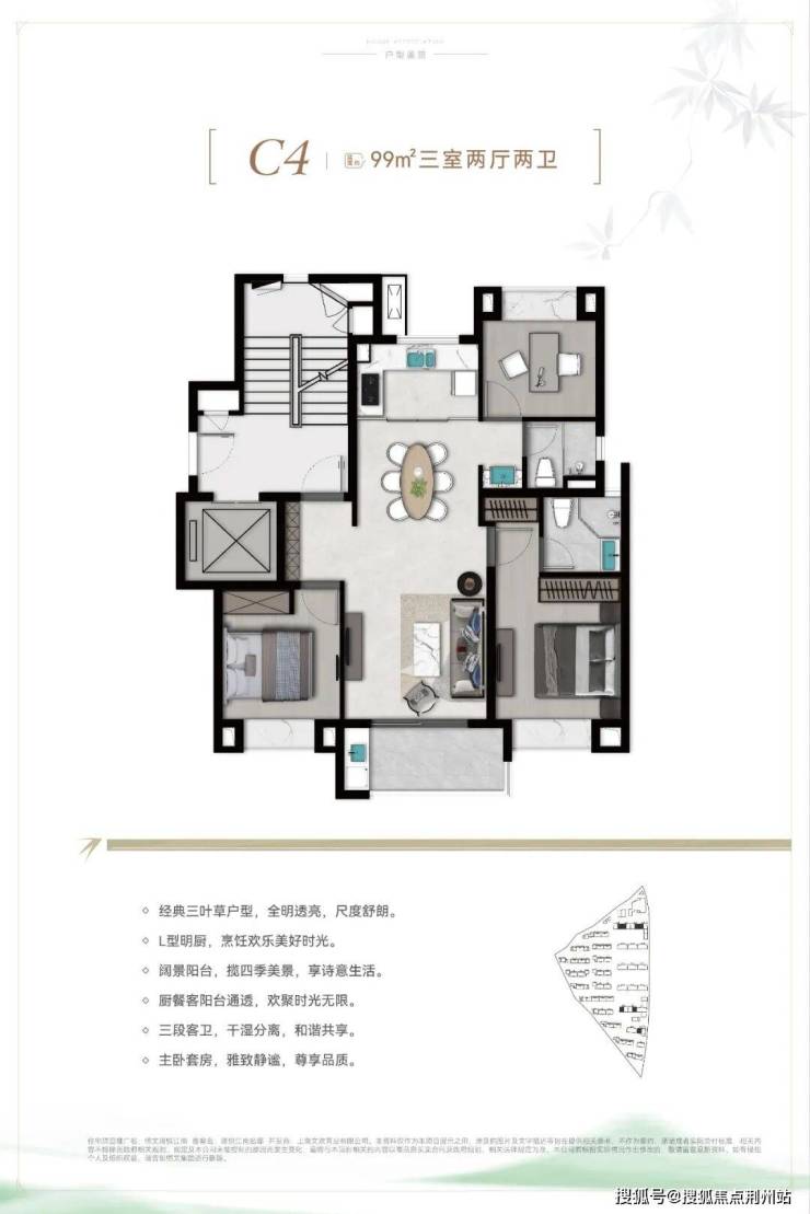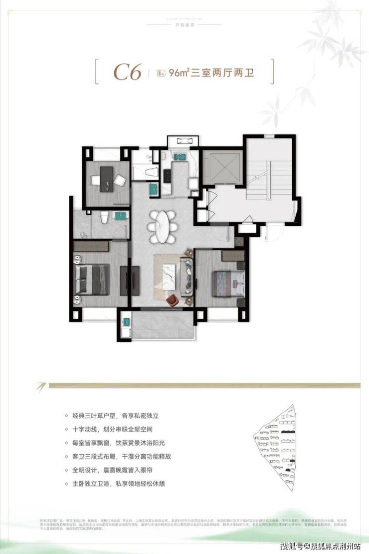 经典三叶草户型,整个户型以客餐厅为中心点,自然延伸至各个功能间,室内没有多余的过道,几乎没有被浪费的过道面积。