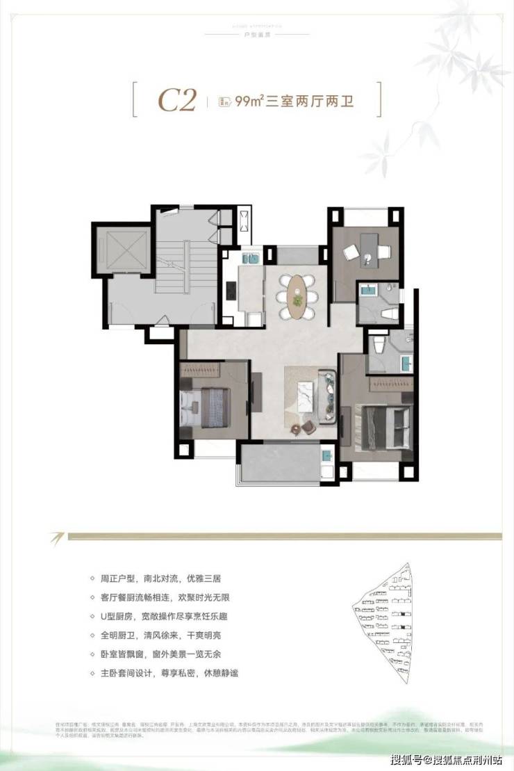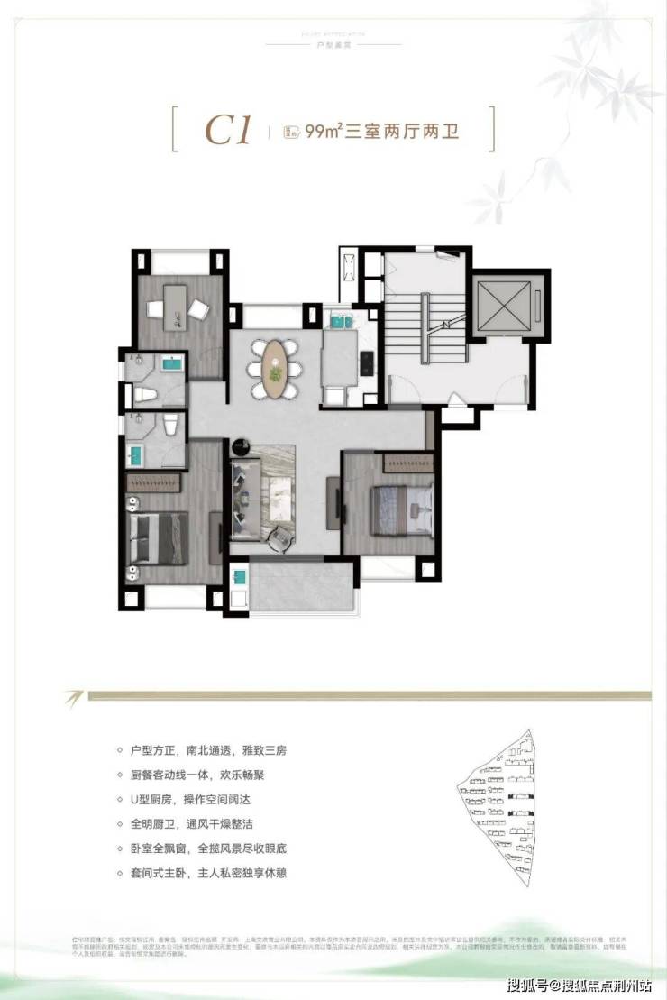 户型三开间朝南、室内3个飘窗+1阳台+主卧套房+“2卫”的设计,不管是采光、视野、通风、私密性,还是实用性都十分出色。