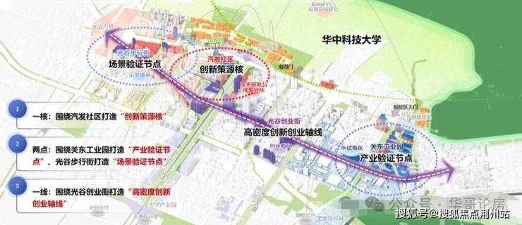 方案规划“一核两点一线”空间布局,即以汽发社区为“创新策源核”,以关东工业园为“产业验证节点”,以光谷步行街为“场景验证节点”,以光谷创业街为“高密度创新创业轴线”。