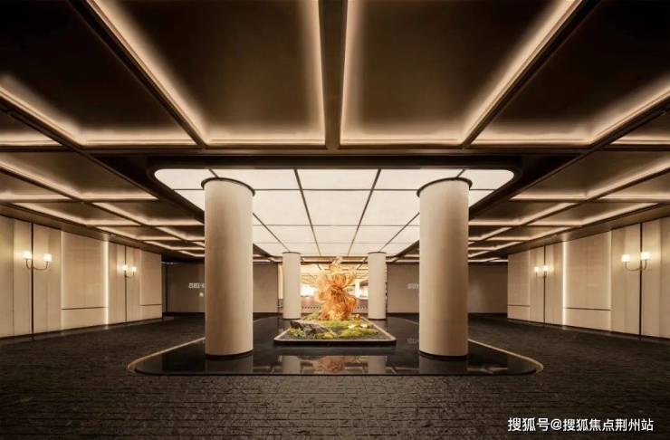 步入门庭,云石吊顶之下,借鉴中国古代建筑中的“藻井”做法,由522片皇家白玉石材拼接而成,凝聚光华,辉映时空。华光之下,中心水池承托起艺术雕塑,莹润皎洁,宛若珍宝。立面则采用铂金钻奢石,搭配墨绿荷塘月色奢石、安哥拉黑奢石花钵、以及手工锻造的巨幅铜门,流淌出一抹温润质感。