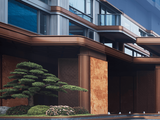 绿城黄浦湾三期的社区大门隐匿在一条安静的小路上,与项目一期的大门镜像而立。门口的环岛落客区设置了花坛、迎客松等,与背后的屏风、门庭以及小区内部的景观相契合,低调却奢华。三期大门实景: