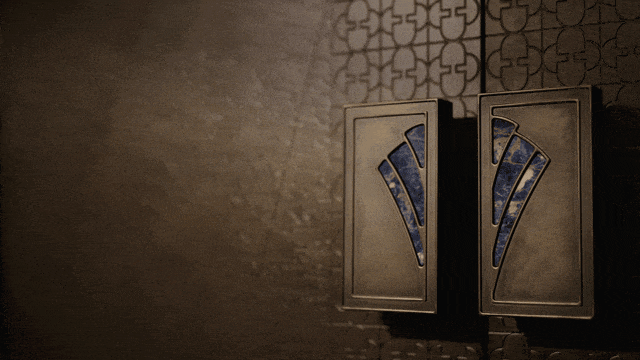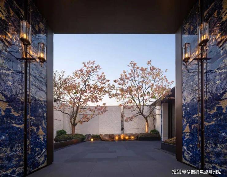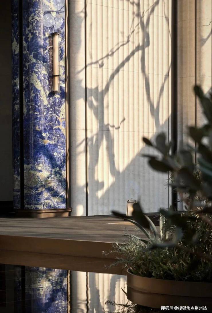 门庭主景墙高约6米,整面以维纳多石材打造。两侧点缀的,是整块镶嵌的全球顶级奢石“景泰蓝”,不仅昂贵且出材率极低。