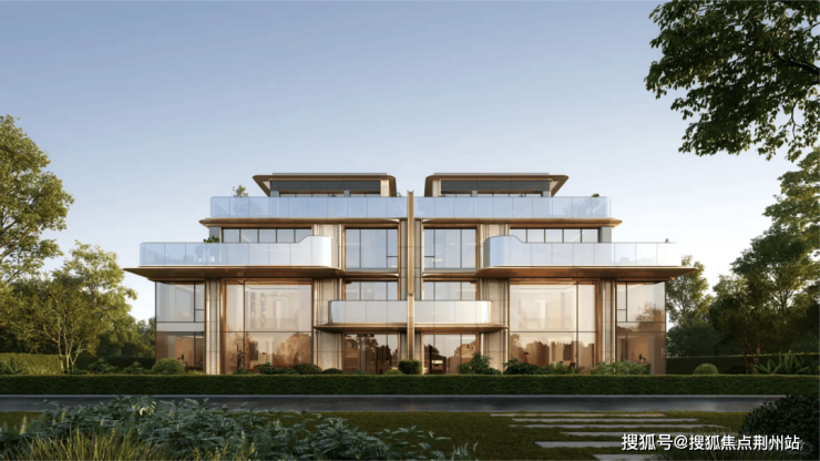 建筑立面选用香槟金铝板、高透光玻璃与石材为主材,整体色温精准调节至3000开尔文(K)——这个色温刻度介于绝对冷调与绝对暖调之间,不刺眼、不冷清,光线柔和内敛。顶端以“花冠生长”的舒展形态整层收束,主体立面融入“水波横叠”的横向韵律线条,整套设计语汇都撷取自明湖的自然意境。对居住者而言,归家途中远远望见的那一抹暖光,本身就是体验的一部分。