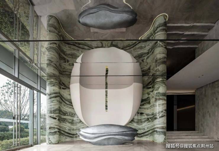 倚山临湖的无锡,“水”是这座城市的灵魂,浸润着不断传承的城市基因。“绿松石”奢石以深邃的质感和奢雅的格调,赋予空间灵动柔和的自然之韵。银色金属接待台呈现出现代主义的抽象与纯粹,搭配圆弧形白色饰面艺术装置,描绘出“太湖明珠”的灿烂图景。