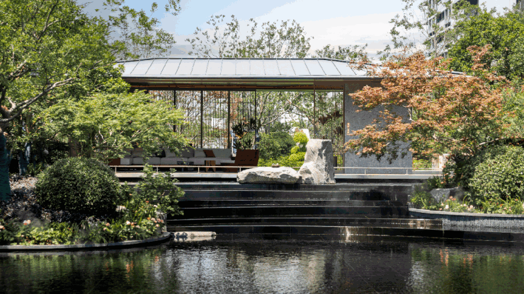 浮岚雅庭:以“侘寂美学”为精神内核,融合原木的质朴与山石的静谧,廊架与周边流水、孤树互为映衬,框景成画,让人在静观中感悟“无一物中无尽藏”的东方智慧。