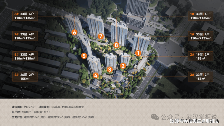 根据规划,项目共8栋19-33F住宅,总户数810户,全盘没有超高层,容积率仅2.5,相比板块内其他超高层小区低密宜居。