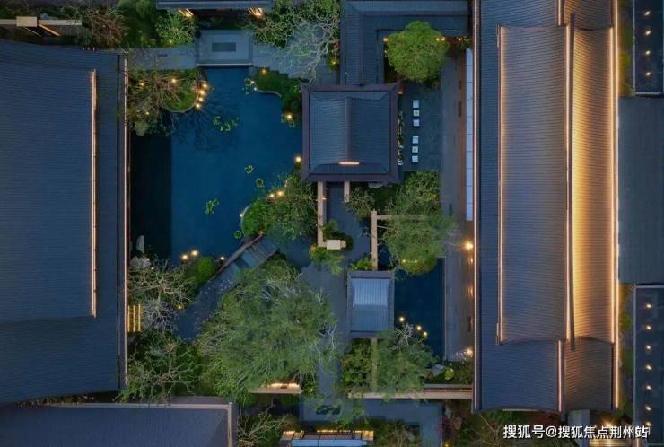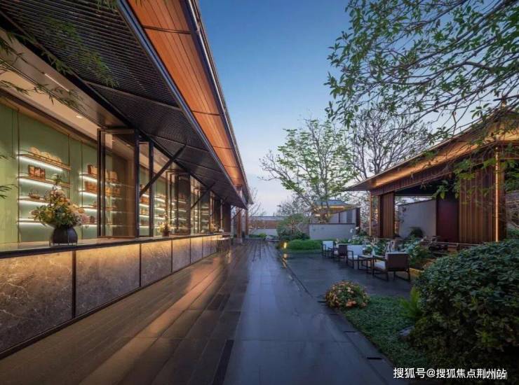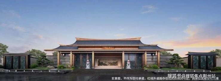 一进门・入境《千里江山图》。大门以《千里江山图》为灵感,采用宋制门堂对称格局,重檐坡屋顶展现极高规制。含两侧景墙总长约63米,两侧全冠移植的罗汉松与镇宅石麒麟,气势恢宏。