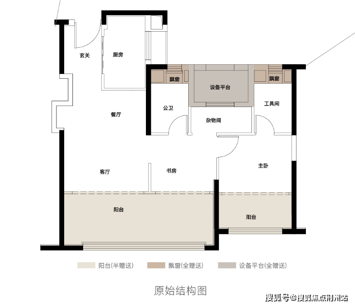 该户型除了南向大阳台、以及飘窗等优化面积之外,还有设备平台优化,因此虽然建面不大,但是能做成标准大三房两卫,据悉这个户型不含电梯前室,仅套内综合得房率就有95%以上。