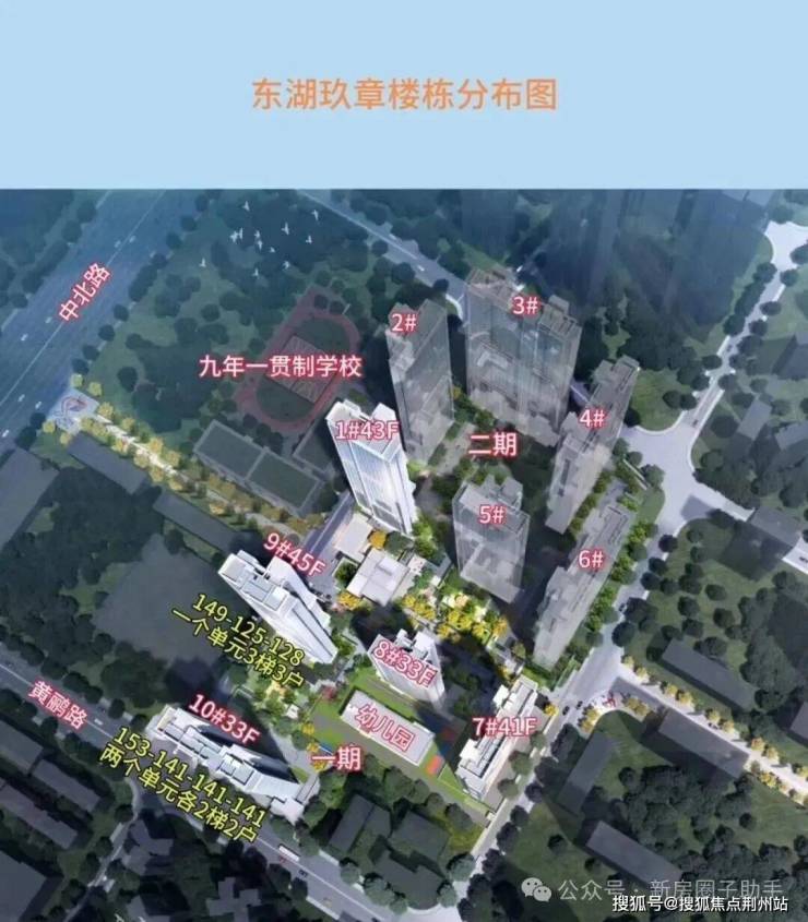 中海·东湖玖章共分两期开发项目总占地约53685㎡,建面约217000㎡,容积率约4.04,绿化率30%,总户数1353户,车位1755个,车位配比1:1.3,物业费3.2元/㎡·月,项目共规划了10栋33-45层,高层/超高层住宅分2期开发,地块需要配建一所九年一贯制学校、一所幼儿园。一期包含1、7、8、9、10号楼共622户,预计2026年6月30日精装交付;二期包含2、3、4、5、6号楼共731户,预计2026年11月30日精装交付。