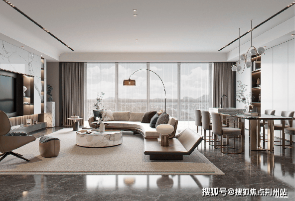 首先,一脉绿城“庐系”极简风格,最大程度地弱化实体墙面,取而代之以大面积玻璃窗。简约的横向线条、超高窗墙比,实现室内室外无界交融,拥抱更多阳光与风景。