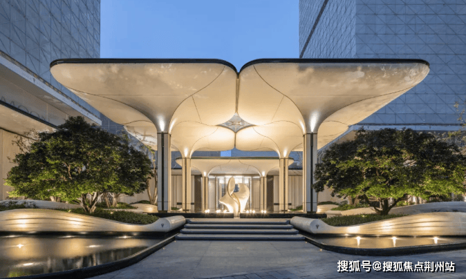 建筑立面以香槟金金属线条勾勒轮廓,在光线下流淌出琥珀般温润光泽。这一暖色系的介入,既延续了“月华系”的现代基因,亦赋予建筑罕见的亲昵感。