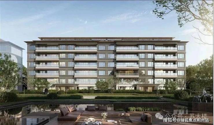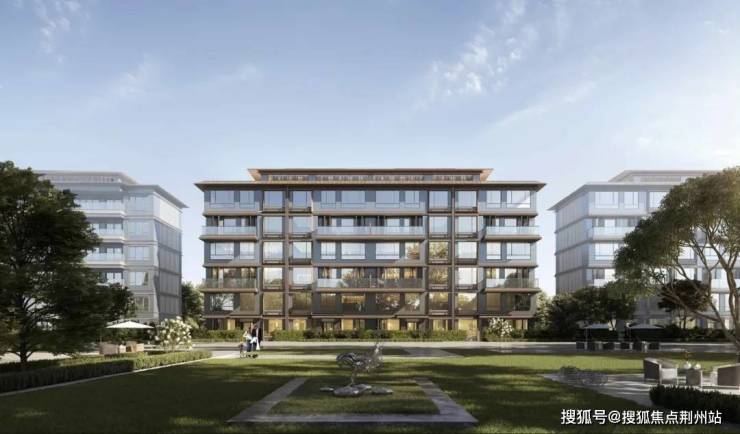 现代简约美学立面,大面积玻璃+石材+金属线条,质感高级通透,户户尽览护城河一线水岸景观。