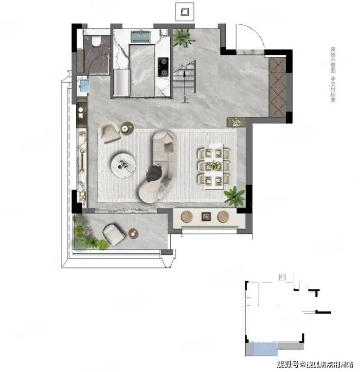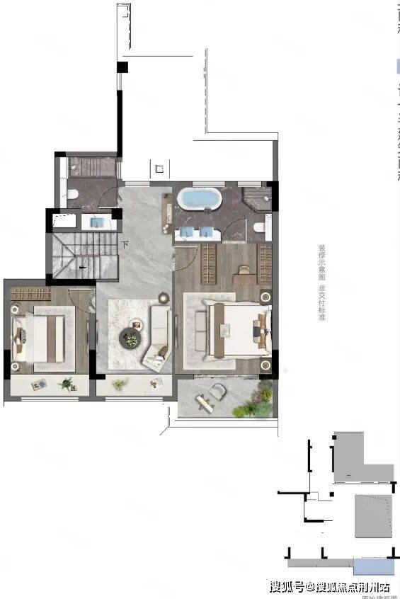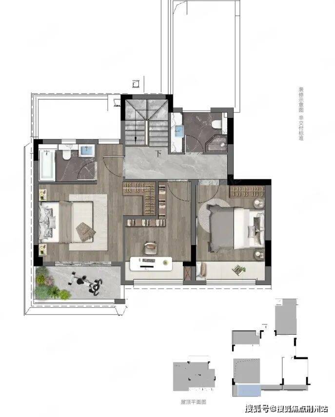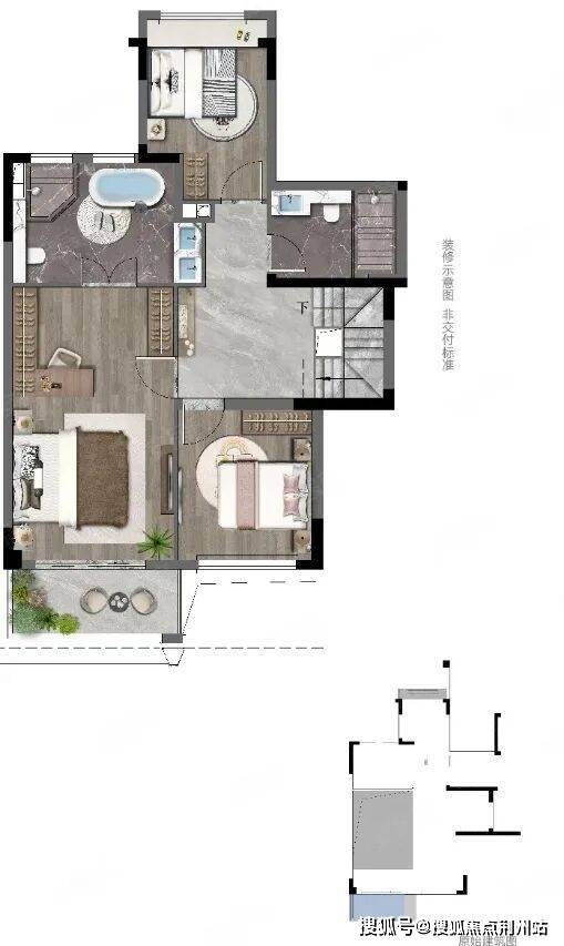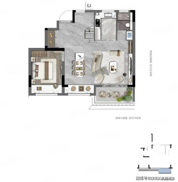 上叠户型,一层LDKB一体化客厅+两个房间,可做老人房或客房。一体化客餐厅直接连通门前绿化,附赠约40-300平庭院。