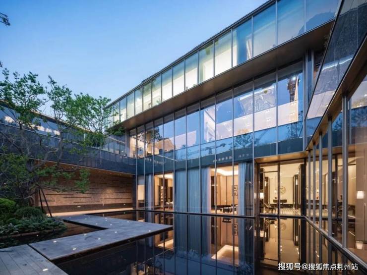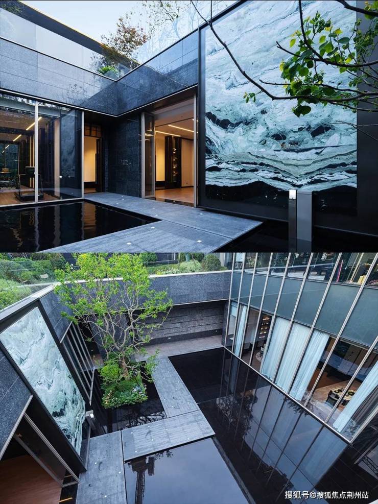 下沉庭院设计了⼤⾯积景观⽔⾯,寓意「引江⼊园」,并以纯粹⼲净的玻璃幕墙与爱尔兰绿奢⽯墙对景,营造出静谧、沉稳、祥和与空灵的氛围,希冀抚平闹市的喧嚣,实现「出则繁华、⼊则静谧」的生活场景。