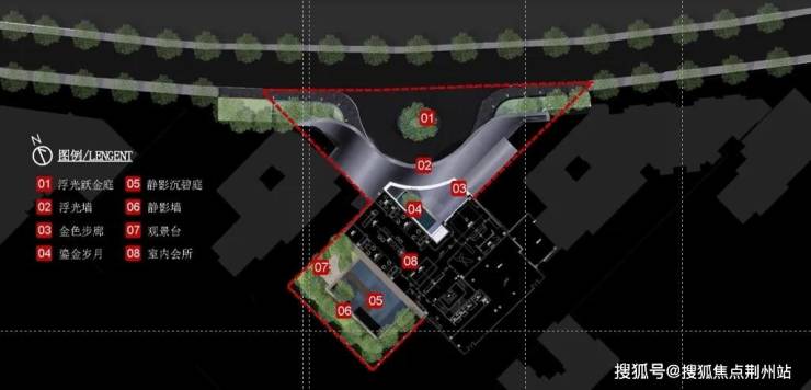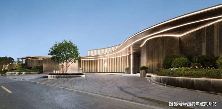 为契合周边环境,示范区建筑采⽤三角形布局,沿街⼤尺度的退让形成前场景观空间,利⽤弧形前场挑檐,弱化与街⾯形成的三⻆空间并向两边延伸,打造超⻓城市界⾯,实现酒店化落客体验,强调归家界⾯的仪式感。