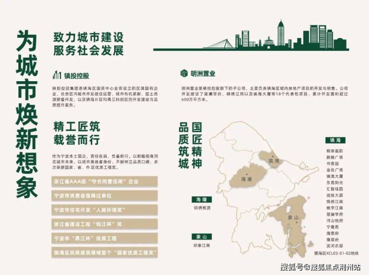 镇投控股——镇海区国资中心全资设立的区属国有企业,旗下明洲置业,匠筑18座品质标杆:从斩获“国家优质工程奖”的镇海大厦,到载誉无数的慧澜学府、锦绣江南……每一座建筑都是国企匠心的勋章 。