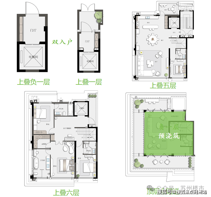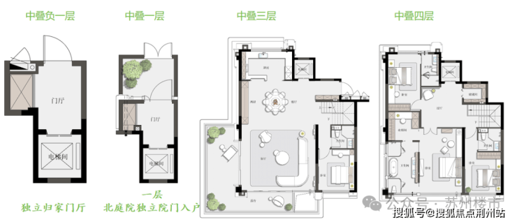 地上归家独立前厅:下叠从南向花园入户,中叠、上叠从北侧独立空间入户,独特的仪式感。