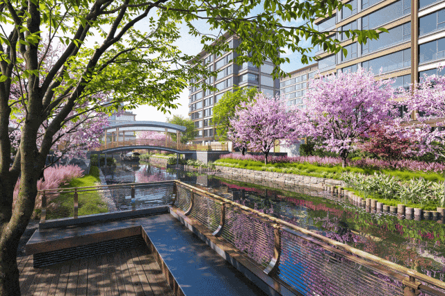 项目南北地块之间,恰好有一条天然水系穿过。建发斥资打造了约500米的“私享滨河景观带”,这里规划了垂钓台、亲水步道、水榭茶寮、观景平台4大滨水主题空间。