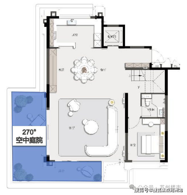 该户型打破 “中叠无庭院” 的固有认知,在首层就配置了270° 空中庭院。