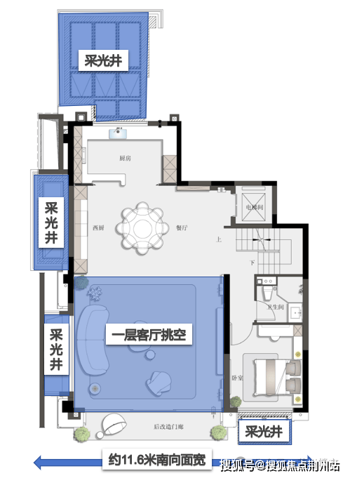 约11.6米南向面宽、客厅近8米视野,搭配约3.4米挑高,单层空间如大平层般通透敞亮。
