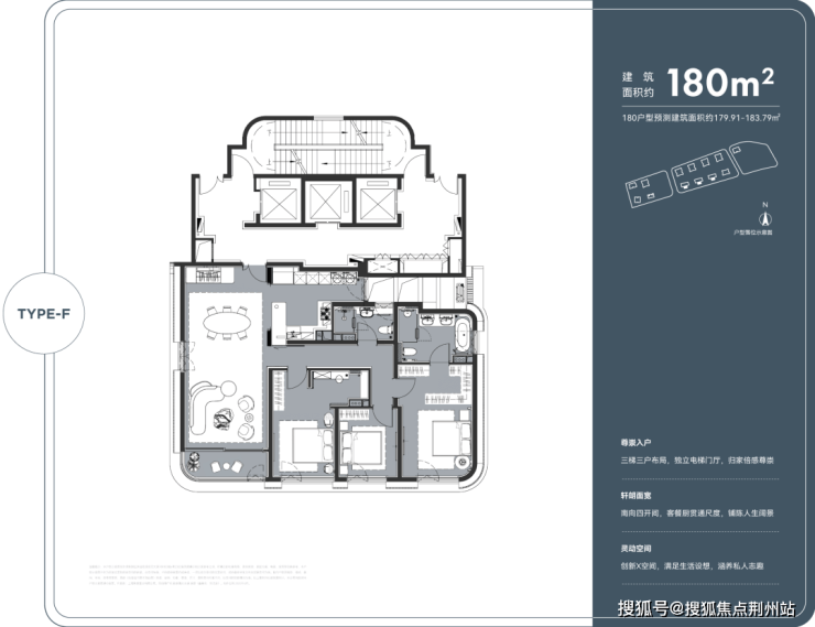 建面约180㎡户型,采用全南向布局,南向四开间客餐厨贯通,将陆家嘴滨江风光自然融入每一个家庭成员的日常起居。