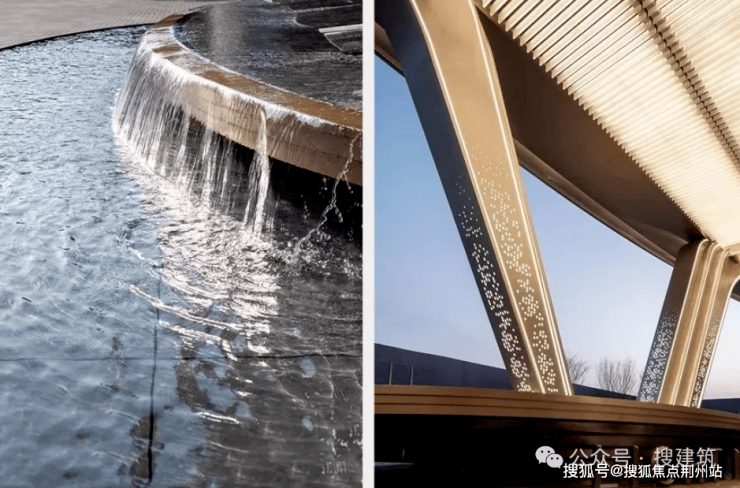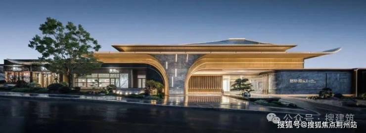 超48米的“山檐归堂”宏伟门楼,宛如一道隐尘闭市的独立门户,完美承袭了川西建筑“大出檐”特色。整个大门采用香槟色的金属主面,搭配雪山银狐奢石,美感独特,气场非凡,左侧车行入口,右侧人行入口。
