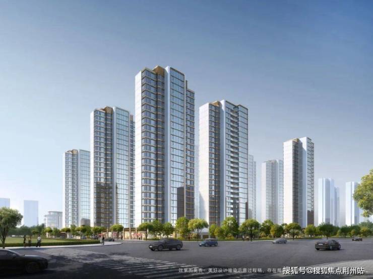 高层楼幢以大面玻璃+香槟金色铝板为立面主建材,金色线条从顶冠向下延伸,勾勒出建筑的挺拔轮廓。