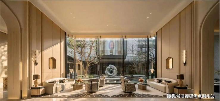小区大门以中式“老钱风”为设计精髓,酒店式落客区尽显尊崇。约76米宽、9.4米高的双子门庭,恢弘大气。光是造价就超过800万,顶部悬空玉琮型装饰选用白雪公主玉石为主材,单体造价高达约4000元/㎡。两侧弧形景墙工艺要求高,石材消耗大,加上金属镂空雕花,整体花费是普通奢石墙的两倍以上。