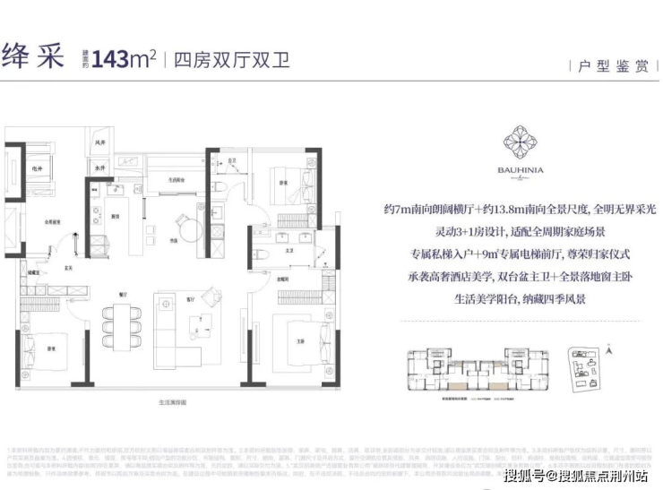 准四代住宅设计:主力户型为143㎡和180㎡,得房率约95%,部分户型带270°观景阳台、双阳台及生活阳台,优化面积较大。
