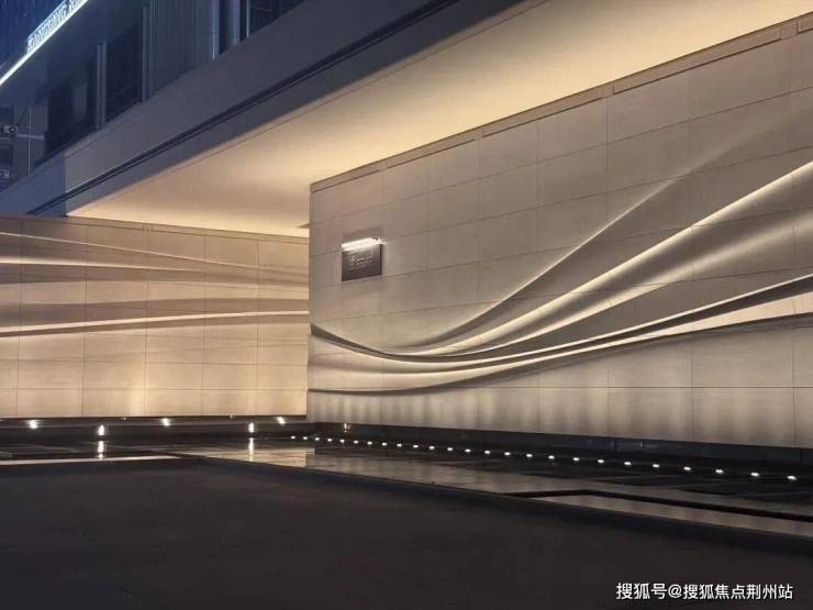 采用米黄色温润石材,巧妙模拟风的流畅形态,营造出既庄重又舒适的归家氛围。这片宽广的流线型石墙在柔和灯光的映衬下,更显璀璨夺目,而风雨连廊的灯带设计,更添一份尊贵仪式感。
