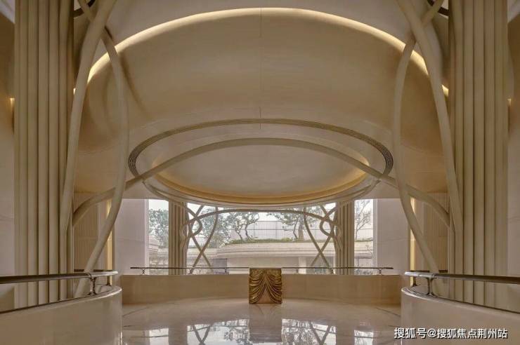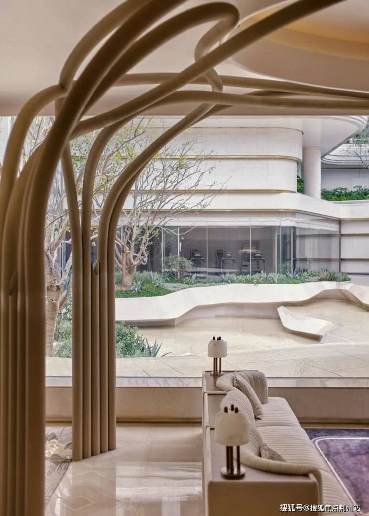 挑高设计的灵感源自峡谷峭壁,既构建了立体高效的功能分区,又让访客仿佛穿行于峡谷之间,获得独特的空间体验。位于归家动线中心的大堂“生机亭”高达15米,成为空间的重要节点。藤蔓造型的装饰与天花板自然衔接,地面与顶面的纹理相互映衬,共同营造出以自然韵律为主题的归家氛围。