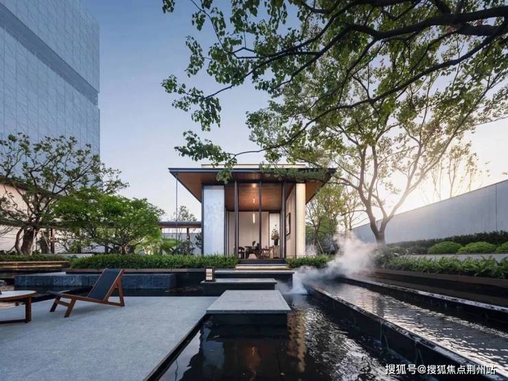 景墙之上,嵌入“保利·拾锦东方”字样的巨石,增添了一抹古朴之美。礼仪门堂两侧的景墙与三组跌水相结合,营造出狭长的入口界面,增强了归家的仪式感。