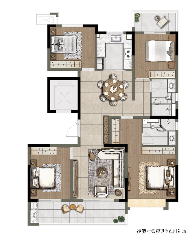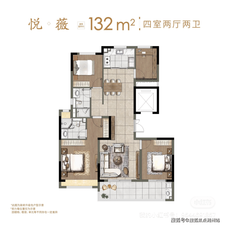 是132㎡户型的升级款。尺度更阔,同时北次卧还设计了一个封闭式阳台。