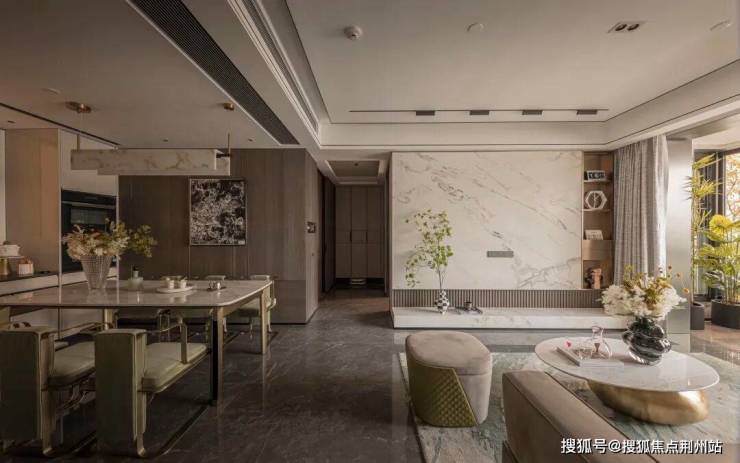 LDKB系统-餐客+阳台一体化:客厅、餐厅、厨房、阳台空间连通,视觉上增强室内空间的通透感,实现大户型的客厅感受;并且通过地暖新风空调的配置,让空间舒适度得以保证。