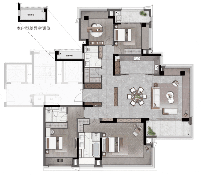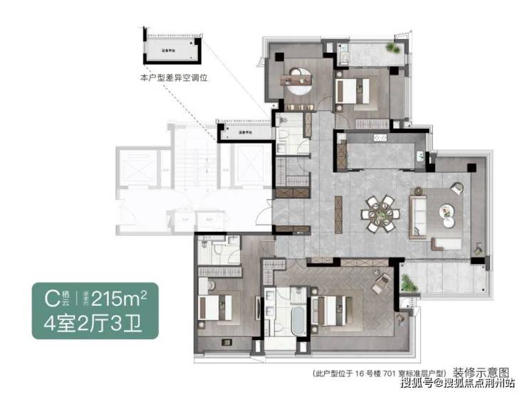 建筑面积约215㎡户型,做了四房两厅三卫的配置,没有用标准化的产品流程,更没有做模板化的产品复制,是在充分调研人群居住习惯改变的基础上,将视野、空间、功能、居住尺度等都做了创新,将超然的住宅理念落地于每一处生活细节。