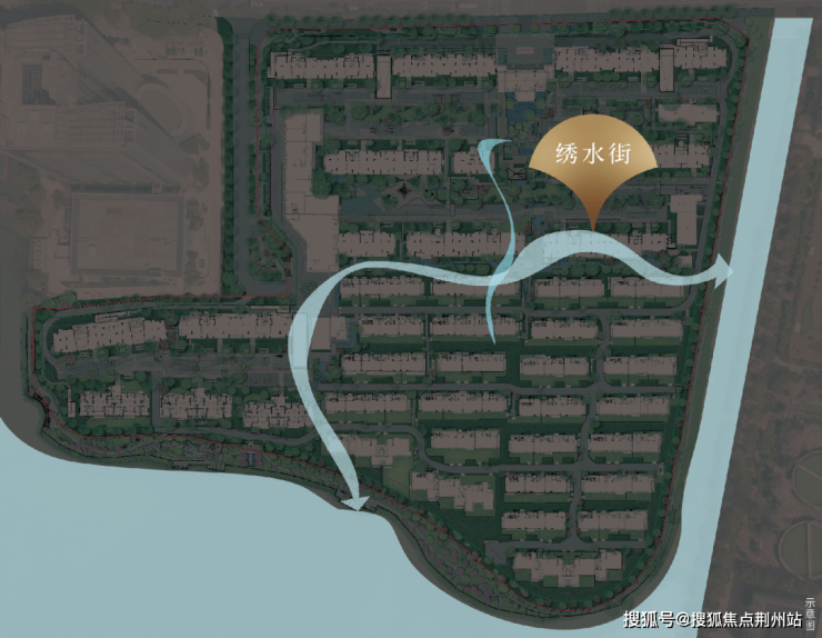 第二条水系,项目内部“引水入园、理水造园、湖水活园”之营造理念,以中央水街串联景观水轴与滨水带,再现"枕水而居”的千年形制,打造“一堤三面湖,水街襟两园,八境共潮鸣"的立体流动庭园。