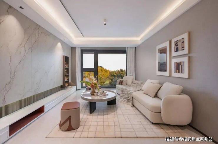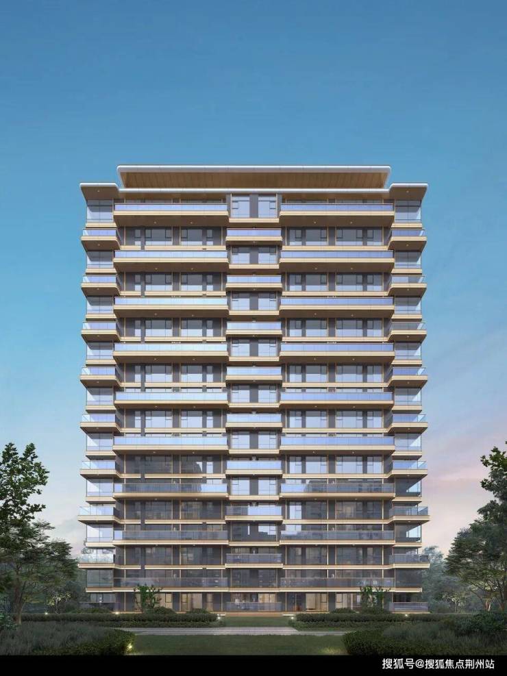 比如建筑立面,是纯铝板石材+大面玻璃的组合,局部加以灰绿色陶板(杭州神盘芝澜月华同款)造型修饰,错层露台对称感更强,玉树金枝的唯美与震撼扑面而来。