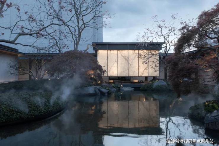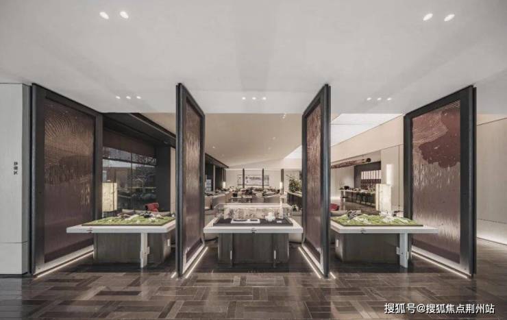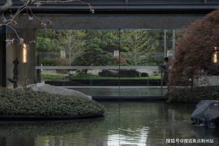 保利姑苏瑧悦取法苏州园林的廊桥框景线条美学,演绎为框体线条造型和简洁舒展的立面肌理。在地取材,运用质朴拙雅的御窑金砖,提取粉墙黛瓦的江南之色,定制兼具东方韵味和现代质感的蟒水纹。