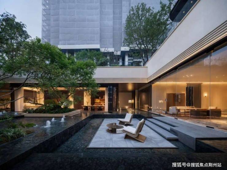从环岛落客的超级界面,到酒店前厅的奢雅迎归,到社区大堂的空间转换,到接待会客的情绪舒缓,到途径建身会所的活力满满,到下沉庭院的无界交流,再到景观花园的闲庭信步,最后到架空层配套的安逸放松。这样的情绪切换、礼序递进,让回家成为一场穿越自然的度假式体验,在考究的场景中,感受高级的松弛感。