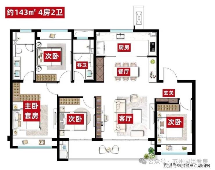 建面约143㎡户型如下,很方正的大四房,目前余2楼、顶楼各1套,总价约430-450万。