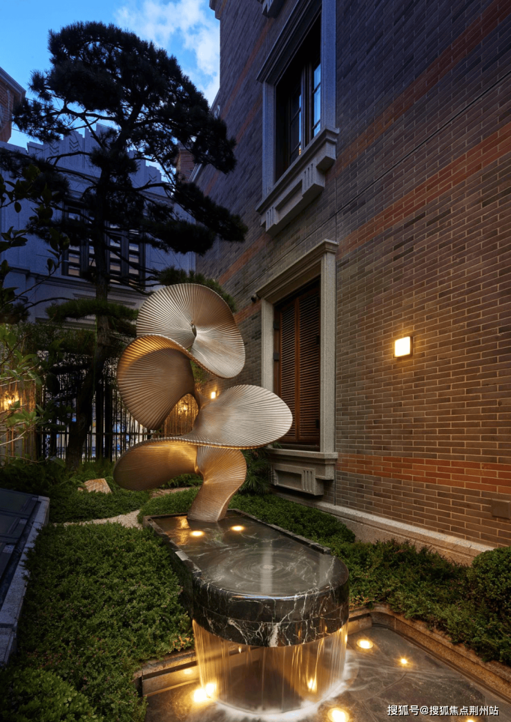 地面延续酒店式落客区海棠纹拼花镶钻,铁打纹工艺,其间还有老石板,青石板,中国黑老石皮,柏坡黄的石皮等原石原面铺装,老石皮从大料里取出,数量少而贵,由此也可看出保利·永兴里在别墅打造上是真舍得,也是真高级。