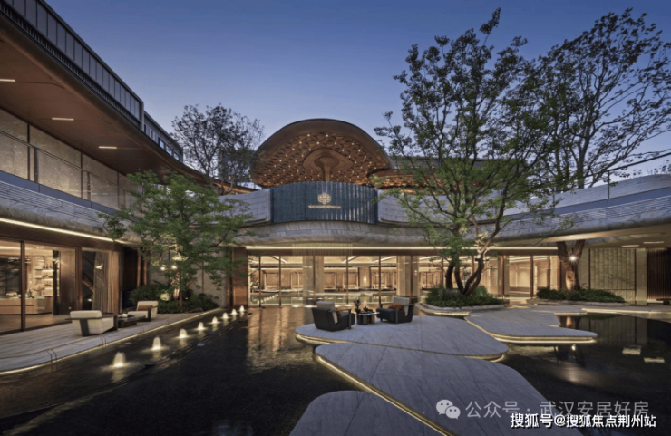 约60米宽、约6米挑高的尊崇门庭,以三进式礼序布局层层递进的仪式感归家动线。法国宝格丽黑石材环岛水景,呼应"龟蛇锁大江"的地理脉络;两侧对称列植名贵铁冬青,寓意"万子千红、家业兴旺";巴西碧潭金沙台阶与安哥拉黑石材叠水相映,象征"步步高升、财源广进",赋予“聚财”、“纳福”、“升贵”的美好祝愿。