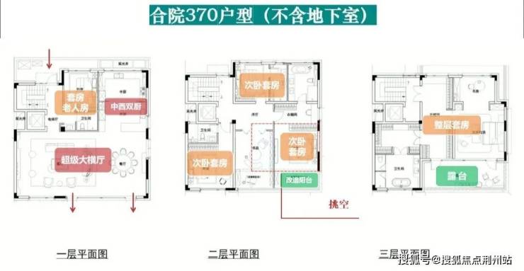 联排三款户型,建面约271㎡/325㎡/369㎡,均为地上三层设计,地下室地下挑高5.6米,可隔2层。