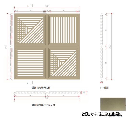 回廊“屏风”参照《四景山水图》中方格挂䈋与僻风䈋的设计,采用蟒水纹样装饰花格不锈钢贴片,空隙图案精确至约3mm,现代金属材料还原宋式方格网状构件,拟现双重肌理,朦胧写意感顿生,建筑风骨丰富显现,烈日黄昏各自斑斓,尽显温润。